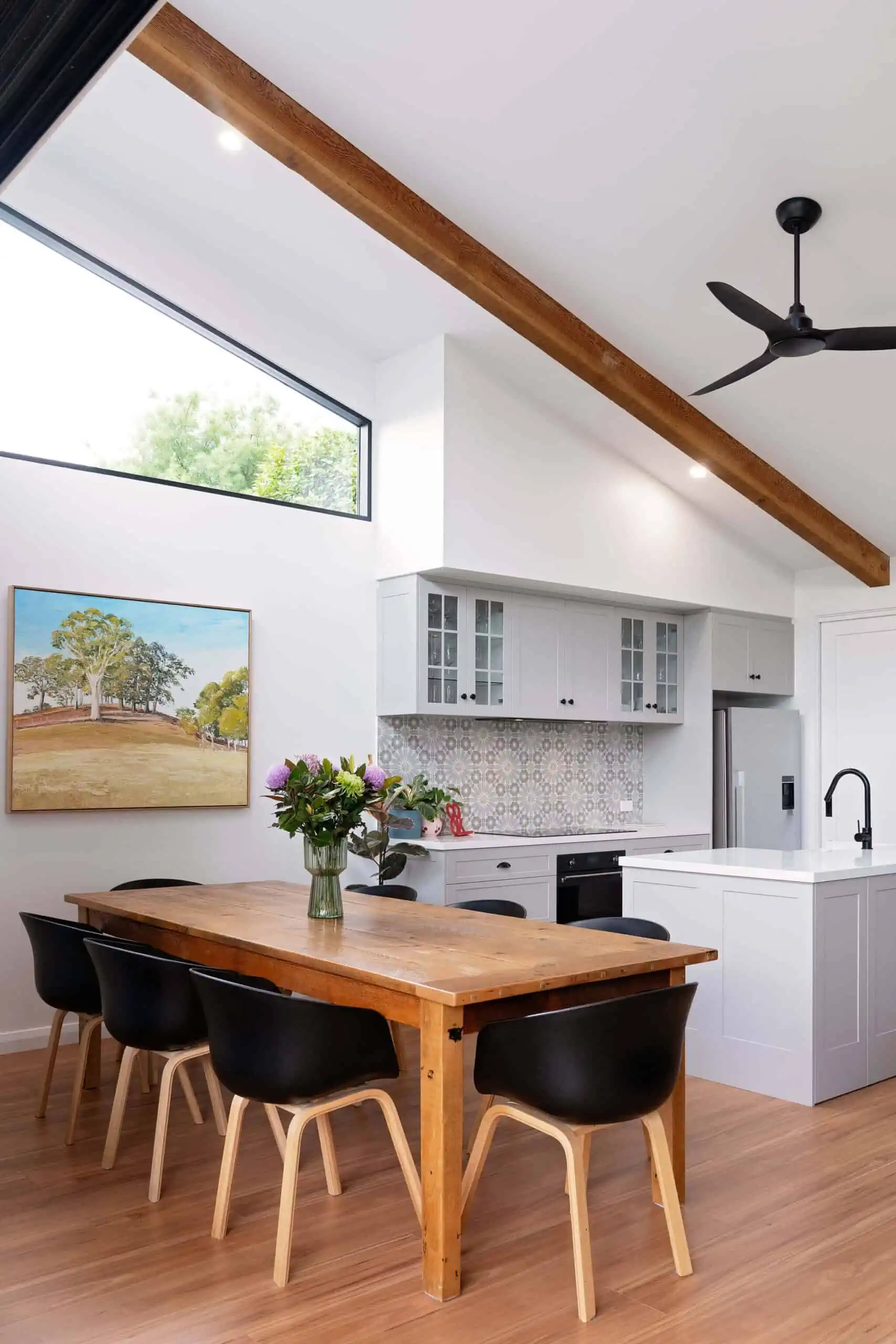 In the new part a light and bright kitchen/living/dining area was created with views into the hills, a master bedroom and ensuite were also added to create a parents sanctuary.